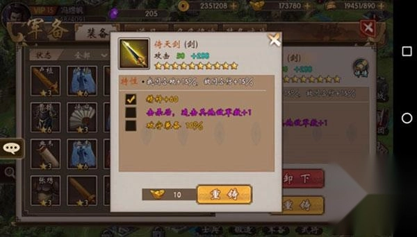 首先进入军备界面,在这个界面里,玩家能够对兵器装备执行卸下、强化、重铸以及出售等操作。