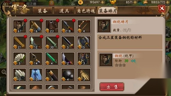 在装备碎片界面中,能够对已收集的装备碎片执行“合成”与“出售”这两项操作。