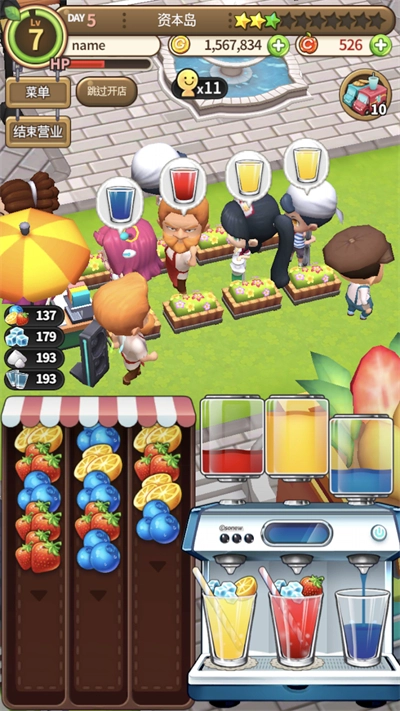 店铺经营:进入游戏后,玩家需要开始经营自己的果汁店,通过消除游戏赚取金币。
