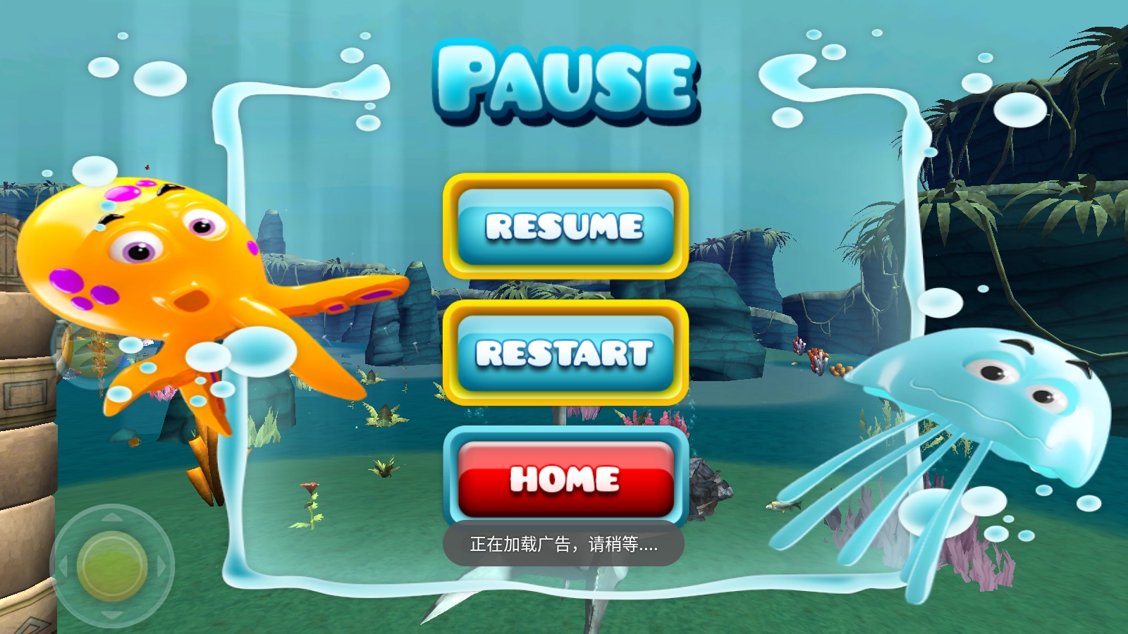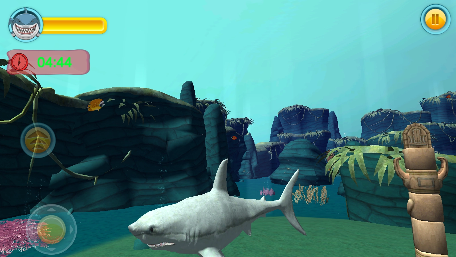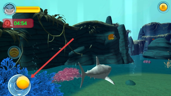 在游戏里,玩家能借助左下角的虚拟摇杆操控鲨鱼的移动,在海底场景中持续探索,以此推动关卡的进程。