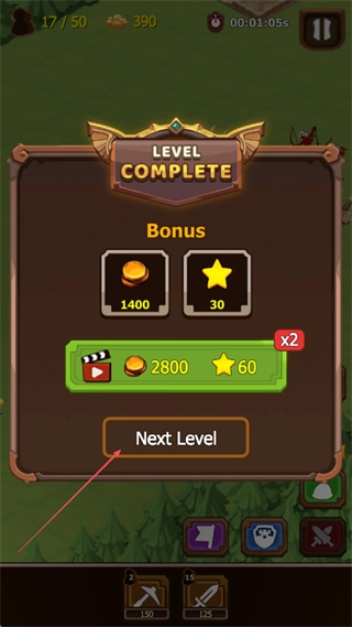 消耗金币解锁Level2以开启新关卡,还能在商店对镐头、时钟等道具进行升级,从而提升战斗能力。