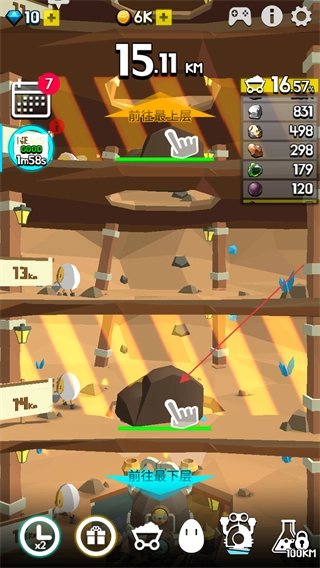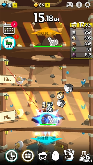 击碎岩石后,点击前往下一层的按钮,即可推进挖掘深度,例如达到15.18千米。