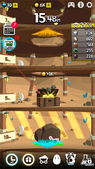 开启宝箱可获得1K金币等额外奖励,持续向下挖掘,以此提高挖掘进度与资源收益。