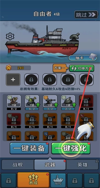 打开武器界面,点击一键强化按钮,就能批量提升武器等级,进而增强整体战斗力。