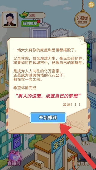 信里说父亲住院了,母亲日子过得很艰难,得靠玩家帮忙赚不少钱,点一下“开始赚钱”就能启动游戏了。