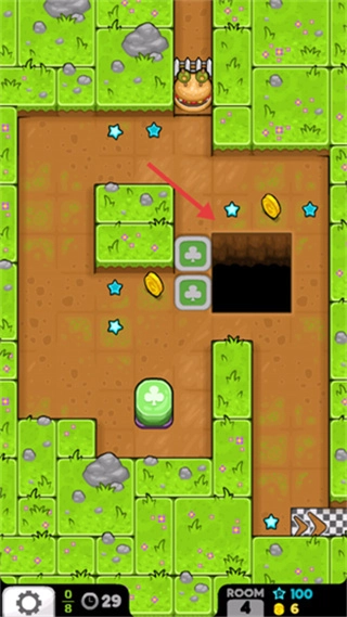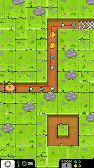 跟着红色路线的指引,收集星星与金币,顺着路径朝着终点前进。