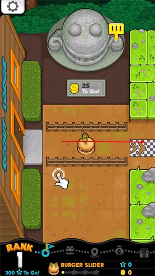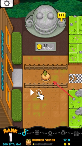 你需要操控汉堡形状的滑块,按照红色箭头指示的方向移动,朝着黑白格子的终点前进,同时开始收集沿途的资源。