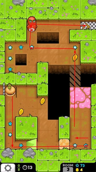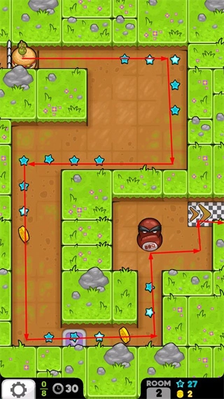 沿着红色路线前进,一路收集星星与金币,避开途中的障碍,同时靠近特殊道具,朝着终点方向移动,以此完成关卡。