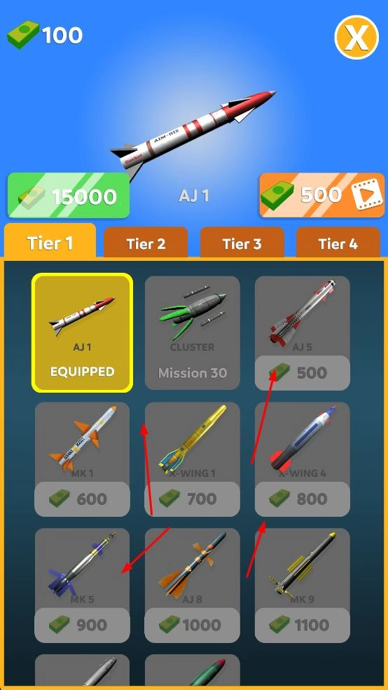 获取游戏内的金币奖励后,你可以用它解锁更高级别的导弹,增强导弹的各项性能,进而去挑战难度更高的任务关卡。