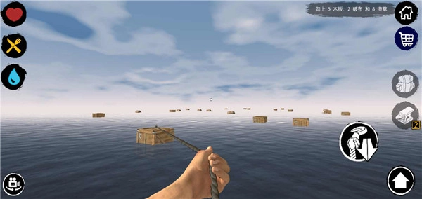 用钩子打捞海上的木桶与木箱,里面或许装有罐装水、食物或是其他资源。