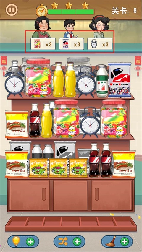 独特的三消玩法,根据上方不同顾客的要求,在满满的货架中找到相应食品吧
