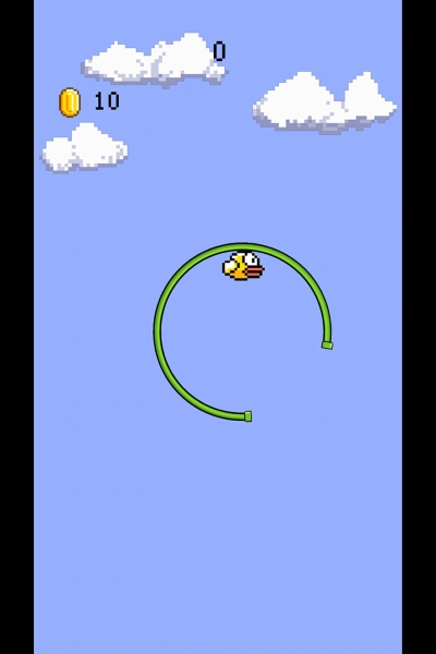 通过屏幕操控小鸟上下飞行,避开绿色障碍物,尽可能多地收集金币来提升右上角的分数。