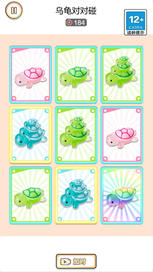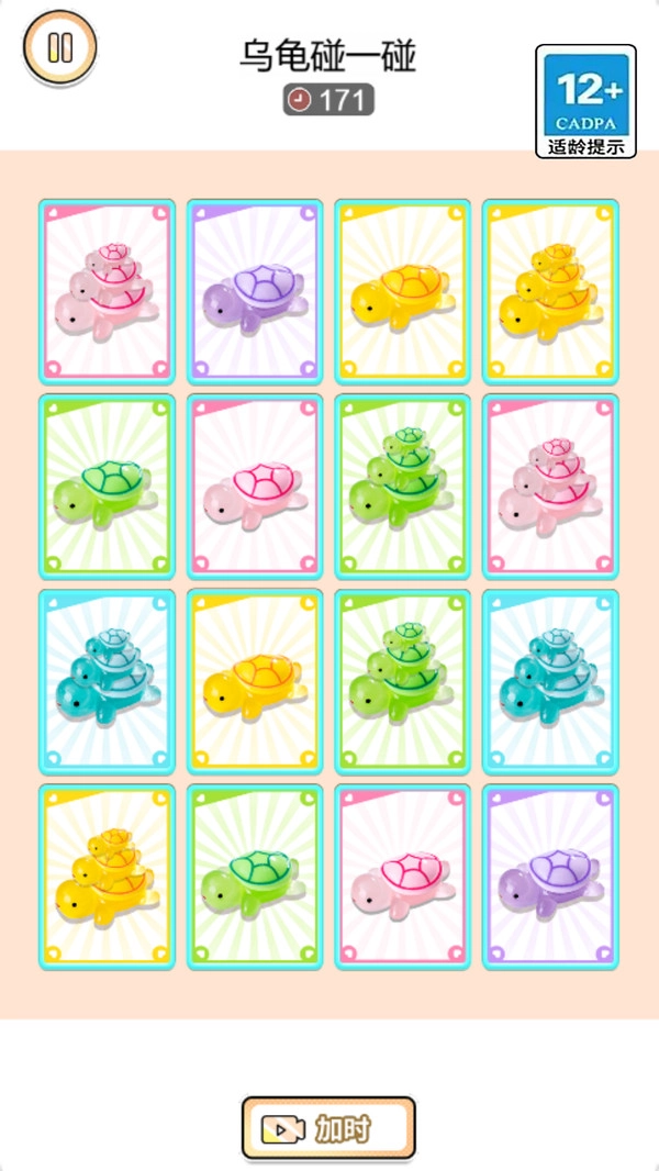 乌龟碰一碰的玩法是这样的:找到相邻且相同的乌龟图案,按住其中一个并拖动到另一个相同图案上进行连线,连接的乌龟数量越多,获得的分数就越高,而且连线的速度越快越好哦。