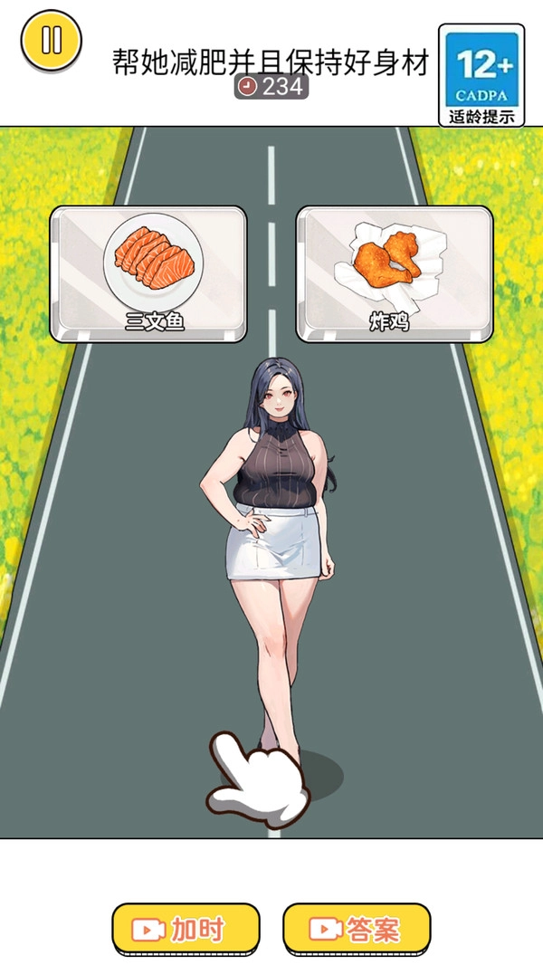 减肥挑战关卡规则:留意提示信息(例如“助力她减重”),从两份食物里挑选更健康的那一个。选正确可进入下一关,选错则挑战失败!