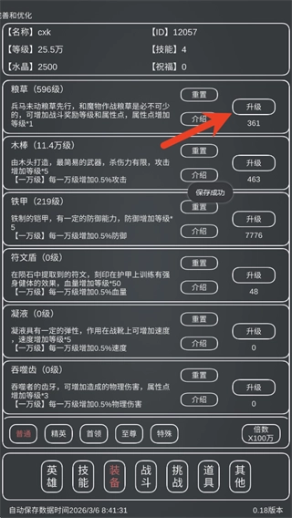游戏的核心玩法是通过击败怪物来提升角色属性,像初始遇到的稻草人,每次成功将其击败就能得到一个升级道具,之后可通过装备界面进行升级操作。