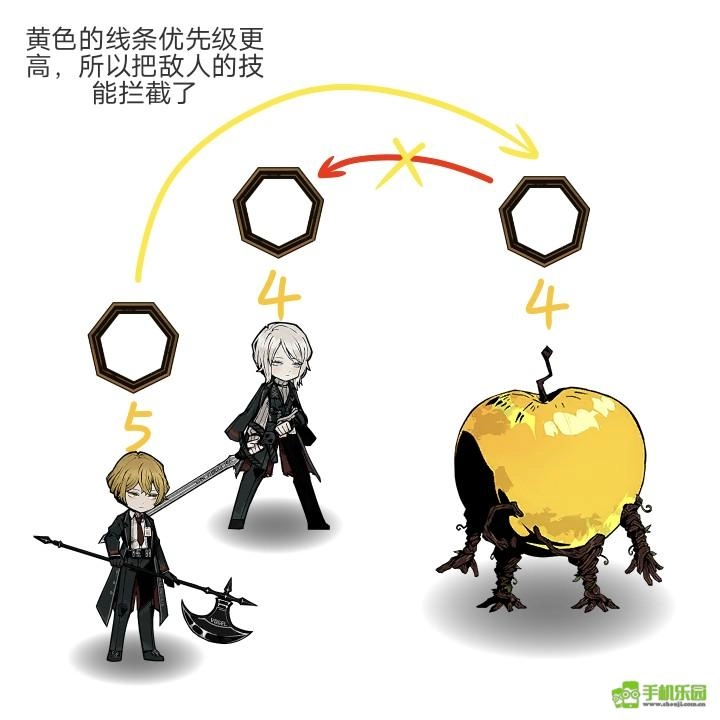 敌人的速度是4,并且锁定了我方的一名罪人,我方还有一名速度为5的罪人,我们让这名5速的罪人对敌人的技能发起攻击,这样就能实现拦截,所以敌人会和5速的罪人展开拼点。