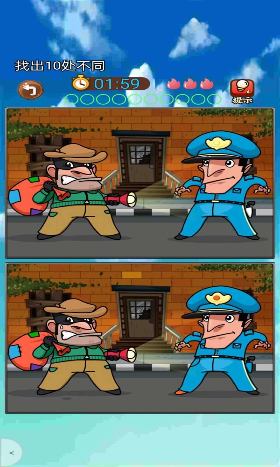 找茬也是一种能力,来挑战一下你的洞察力吧!在游戏里,玩家要在规定时间内,从两张看起来完全相同的图片中找出十处不同。游戏关卡主题多样,涵盖建筑风景、影视动画、卡通角色等,就是为了考验你的眼力,欢迎大家来体验找茬的乐趣!每个关卡都有不同的任务,还有时间限制,只要仔细观察、认真找茬,就能获得高分。此外,游戏中还有实用的道具,可以大大降低游戏难度。