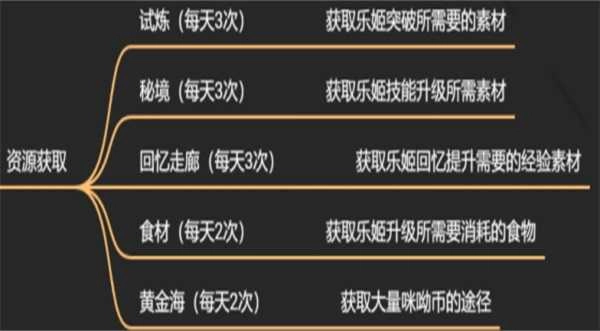 想要提升实力,就得先去挑战每日限量的资源获取关卡!这些关卡主要分为五个部分,能分别获得游戏通用的咪哟币、乐姬升级用的食物、乐姬回忆及其所需的经验素材、乐姬技能升级材料,还有乐姬等级突破材料。强烈建议指挥官每天都把这些副本打完,毕竟这可是游戏里最主要的资源获取渠道之一呢。