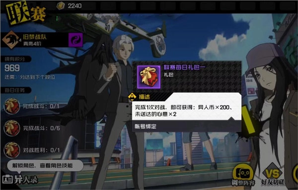 各位玩家完成前期新手教学阶段的主线任务后,就能解锁异人联赛玩法。在游戏UI页面的右上角,能找到“联赛”字样,点击进入后选择“开始挑战”,就能快速匹配到另一位玩家,随即展开异人之间的较量。