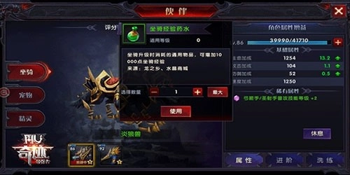 玩家点击右上角的经验加号,就能给坐骑升级。升级之后,坐骑的基础属性会得到提升,还能查看适合自身职业的稀有属性。