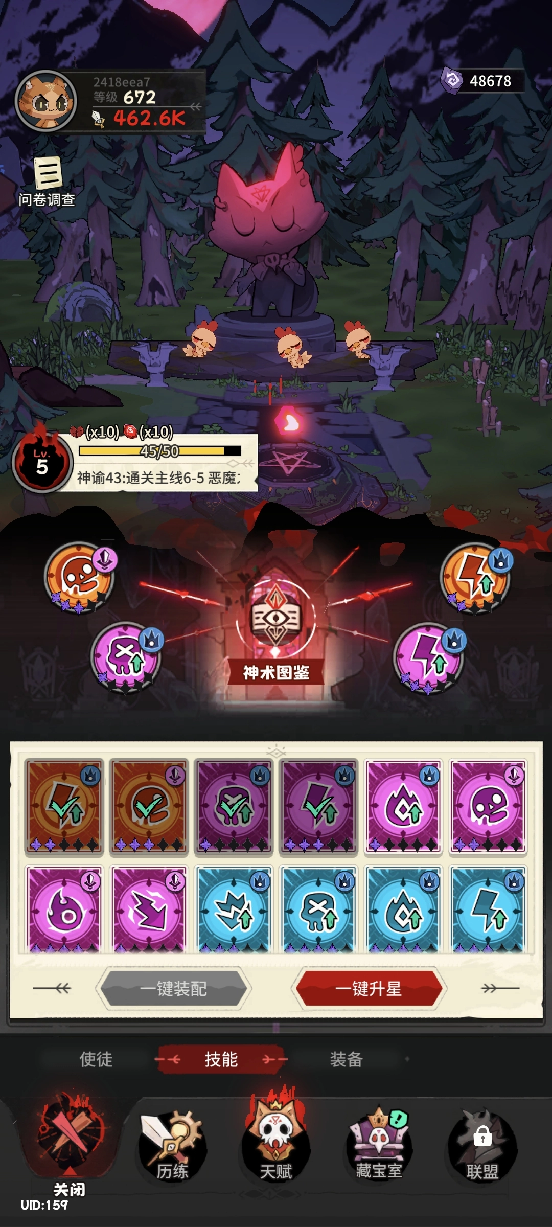 1,最容易踩坑的地方是,用钥匙十连抽技能后,务必去技能界面进行一键升星。大家可以参考本攻略的第二张图片,中间位置有个神术图鉴,一键升星后如果看到它出现叹号,一定要点进去激活属性!因为技能升星能带来大量的属性提升。