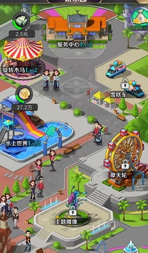 水上世界(金币、铝合金、改装件)、摩天轮(购物卡、培训点)、主题雕像(提升接待能力)