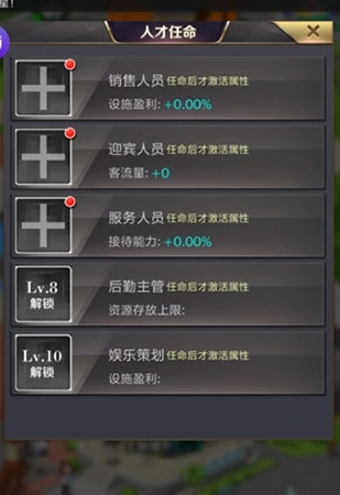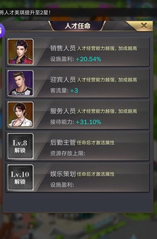 在服务中心通过人才任命能够提升收益,人才的经营能力越强,带来的收益加成也就越高。