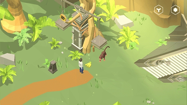 当脚踩在眼睛上时,就会升起两个物品,你需要拿到位于右侧的金币,并将其放置到左侧的架子上。