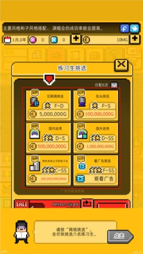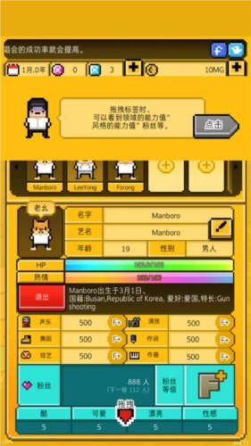 月刊偶像最新版是一款像素风格的模拟经营游戏,以备受关注的偶像练习生为主题。玩家在游戏里经营一家演艺公司,招募艺人并组建团体,助力他们出道。游戏玩法贴近现实,玩家需通过发行专辑、参与通告、举办演唱会等活动提升偶像团队的影响力,逐步让旗下艺人走向国际舞台。