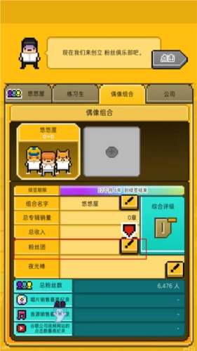 偶像组合,这就意味着要开始建立粉丝团了,通过这个途径可以获取收入。点击下方的笔形图标来创建粉丝团名称,挑选夜光棒之类的应援物品,把粉丝聚集起来就能赚取更多收益。