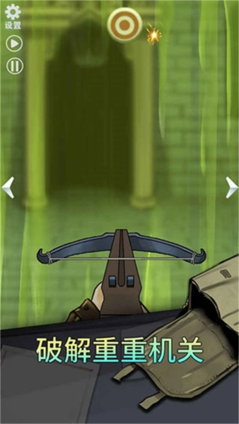 用弩瞄准远处的大门,参与一个简单的射箭小游戏——当靶子快要移动到中心位置时,迅速点击右侧的发射按钮,让箭命中靶子,完成后即可进入大厅。
