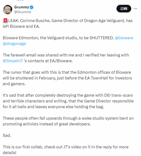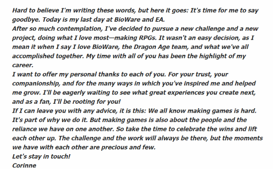 泄露者表示,Corinne Busche发布了一封告别邮件:“很难相信我写下了这些话,但事实就是如此:是时候说再见了。今天是我在 BioWare 和 EA 的最后一天。经过深思熟虑,我决定接受新的挑战和新的项目,做我最喜欢的事情——制作 RPG。这不是一个容易的决定,因为我说我爱 BioWare、龙腾世纪团队以及我们共同取得的成就。与你们在一起的时光是我职业生涯的亮点。”