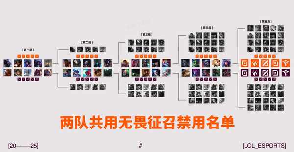 第二局起,禁用英雄数量逐局增加,直到第五局总计50个禁用名额(10个标准禁用+40个无畏禁用)。