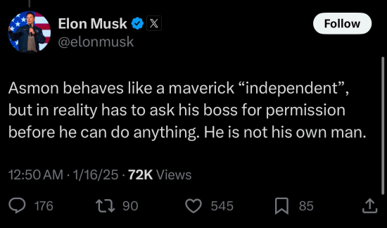 此举似乎激怒了马斯克——这位亿万富翁昨日发文嘲讽Asmongold是“傀儡”,账号由团队运营,做任何事都需要得到老板的许可。此外,马斯克还泄露了与Asmongold私信截图,并移除了Asmongold账号的认证标记(现在已恢复)。