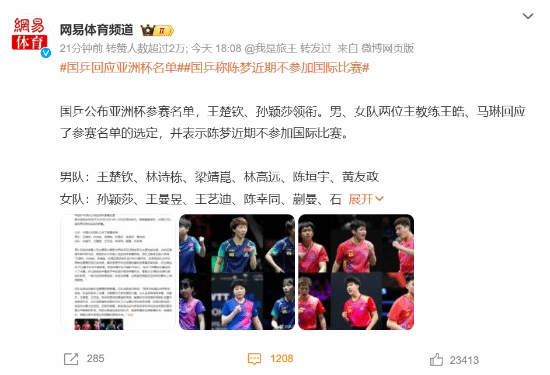 国乒公布亚洲杯参赛名单,王楚钦、孙颖莎领衔。男、女队两位主教练王皓、马琳回应了参赛名单的选定,并表示陈梦近期不参加国际比赛。
