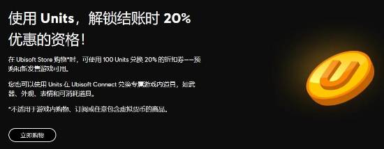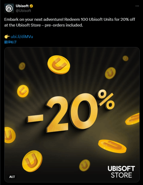 育碧今日发推文,提醒玩家使用100U币兑换8折券,在育碧商城购买游戏时输入代码即可享受额外优惠,并特别强调能用于预购。