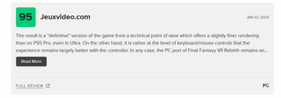 Jeuxvideo.com表示:“《最终幻想7:重生》PC版可以说是终极版本,有着比PS5 Pro稍微精细的渲染效果,在顶级画质下也是如此。另一方面,在控制方式上,键盘/鼠标的体验仍然不及手柄更为流畅和舒适。无论如何,PC版的《最终幻想7:重生》仍然是体验的绝佳途径。”