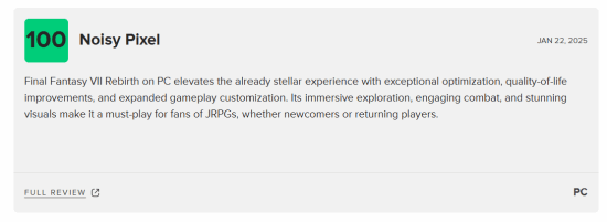 Noisy Pixel表示:“《最终幻想7:重生》PC版凭借出色的优化、品质提升以及更多的游戏定制选项,使本就出色的游戏体验更上一层楼。游戏中引人入胜的探索、富有挑战性的战斗以及令人惊叹的画面,使其成为无论是新玩家还是老玩家都不容错过的JRPG必玩之作。”