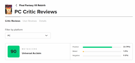 《最终幻想7:重生》将于今日正式登陆PC平台,Steam国区预购将在今晚10点正式结束,且玩家在Steam首发期间可享受七折优惠,标准版折后价为312.2元人民币,豪华版为401.1元人民币。截至发稿前,《最终幻想7:重生》PC版在M站的媒体评分已经新鲜出炉,为90分。其中多家媒体打出了90分以上至满分的评价。