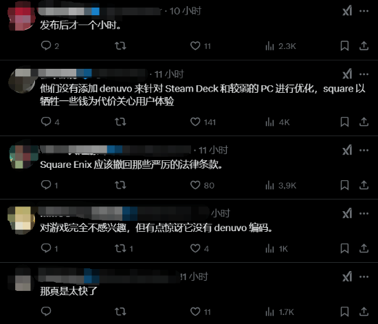 社区对于此事的反应不一。有人认为,Square Enix最近发布的“员工骚扰政策”有玩家堵嘴的意思,他们的游戏遭到破解是“报应”。也有人认为,Square Enix为了玩家的体验没有使用D加密,这种情况下再破解游戏就有点“不仁不义”了。