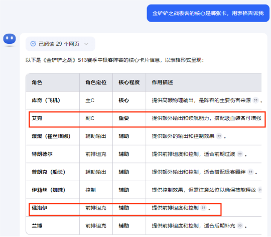 Kimi的回复非常详细,而且会用表格列出重点,一目了然。特别是讲了艾克是最重要的副C,飞机是传统的主C,还配有作用描述。