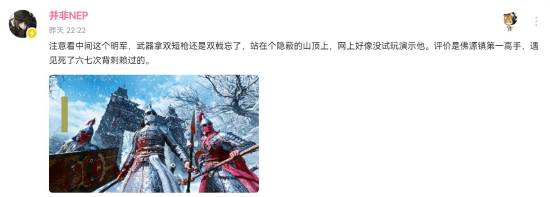 有UP主发文透露《明末:渊虚之羽》的超强明军敌人,站在隐蔽的山顶上,武器拿着双戟,造型帅气令人期待。评价是佛源镇第一高手,遇见死了六七次背刺赖过的。