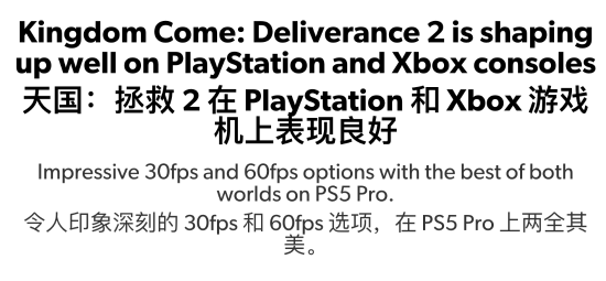 日前,Digital Foundry(数毛社)发布《天国:拯救2》评测,该作在PS5 Pro上有着出色的优化,让画质和帧数兼得。