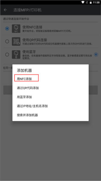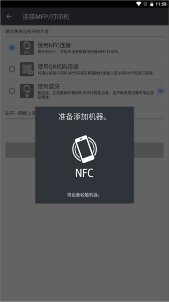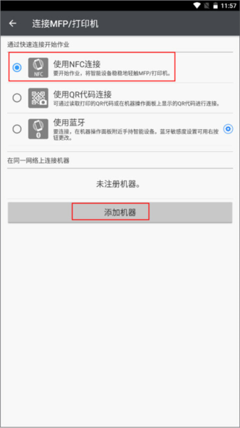 2、有以下几种连接打印机的方式,以使用NFC连接为例,点击下方的添加机器。