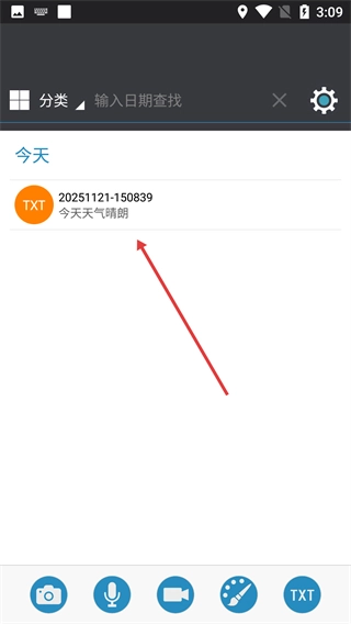4、在主页面可查看已保存的文字记录(如20251121-150839 今天天气晴朗)。