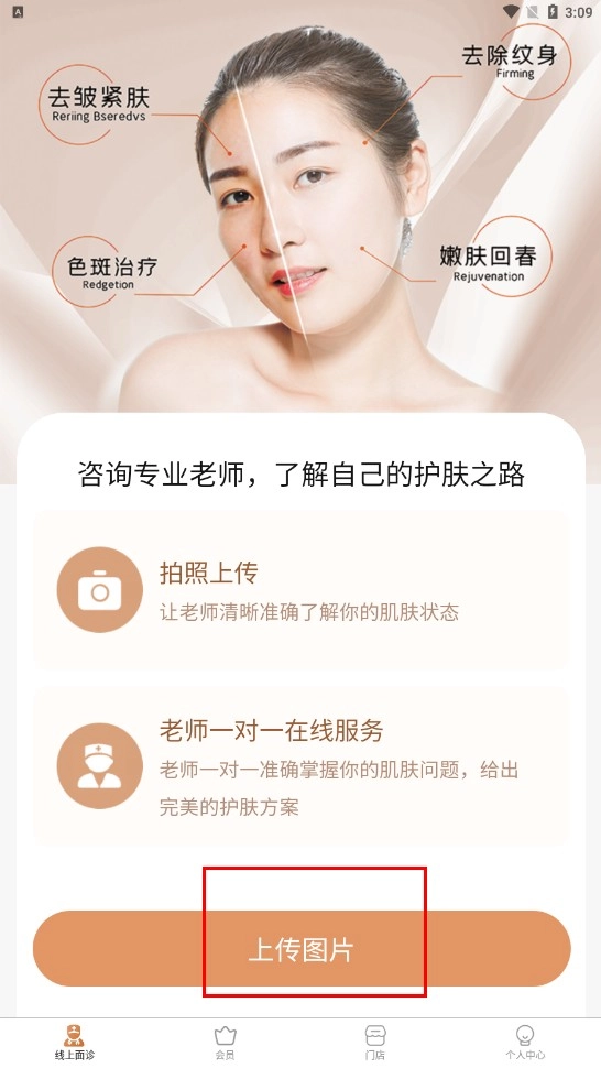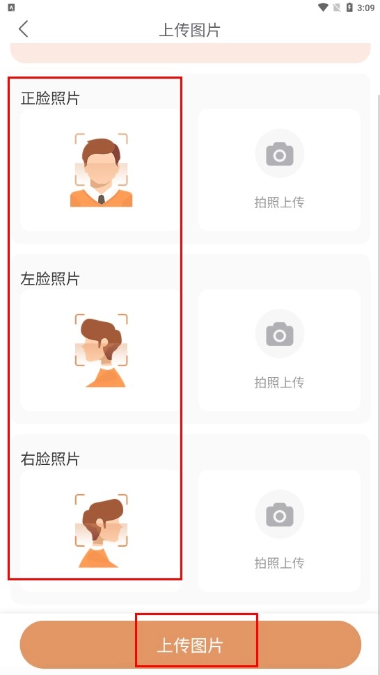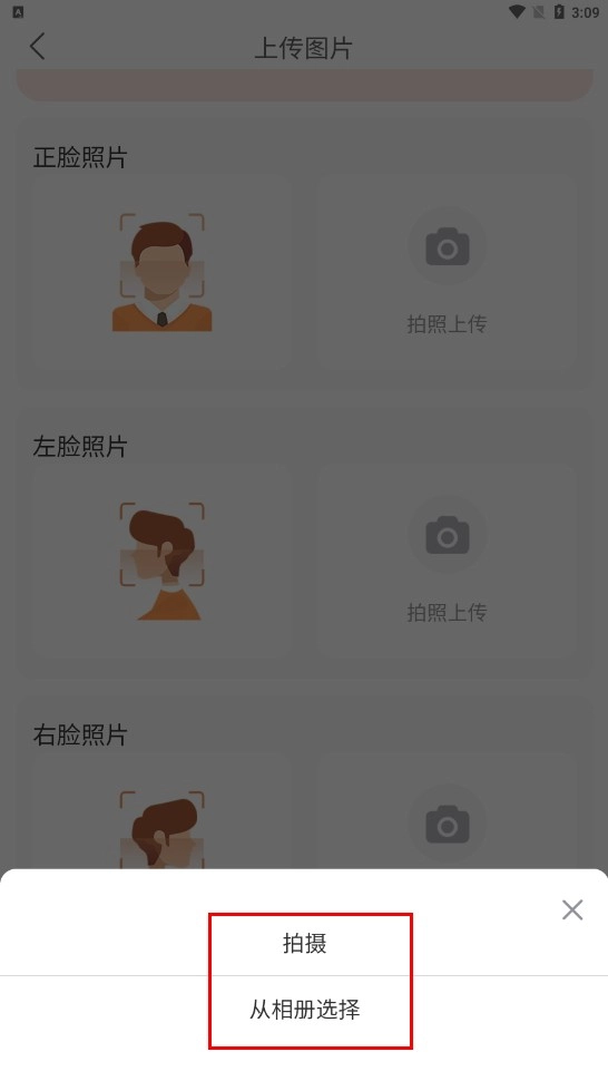请选择需要上传的正脸、左脸或右脸照片类型,做好上传准备。