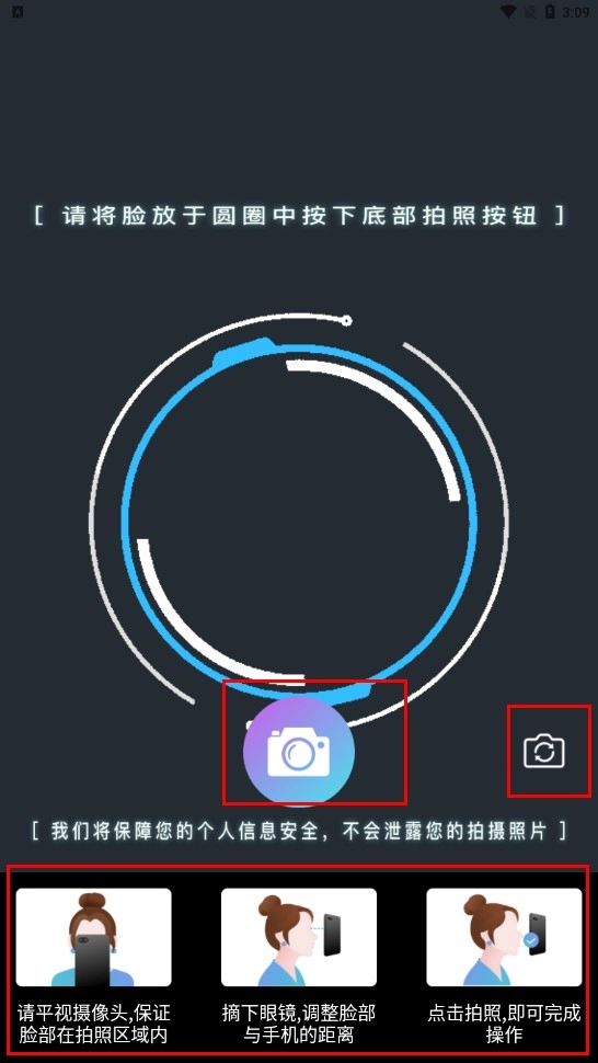 若选择拍摄,可将面部置于圆圈内,按下拍照按钮;若有需要,也能点击右下方的选择摄像头,按照提示操作完成拍摄。