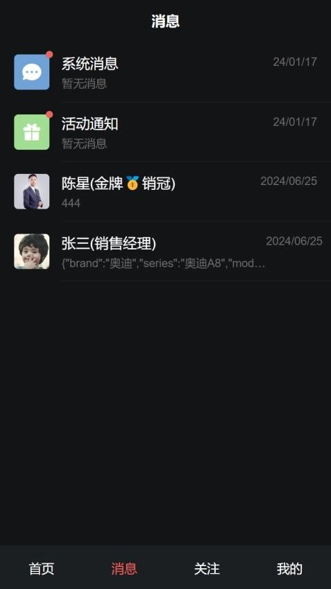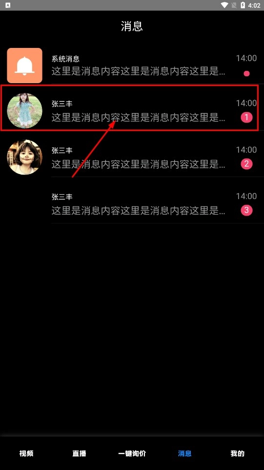 进入【消息】界面,查看联系人中张三丰等人的聊天列表,点击进入对话窗口。