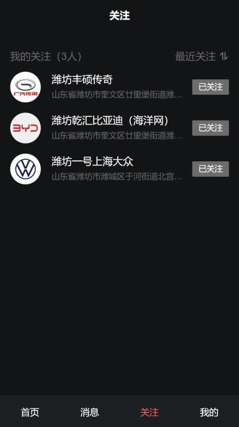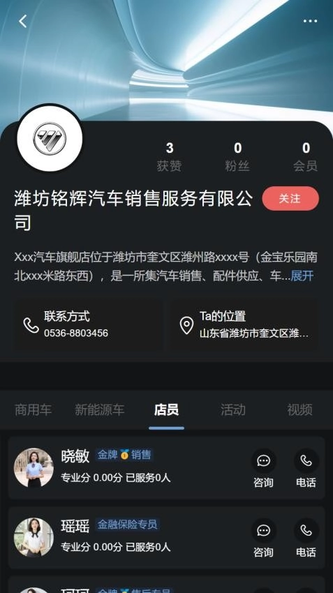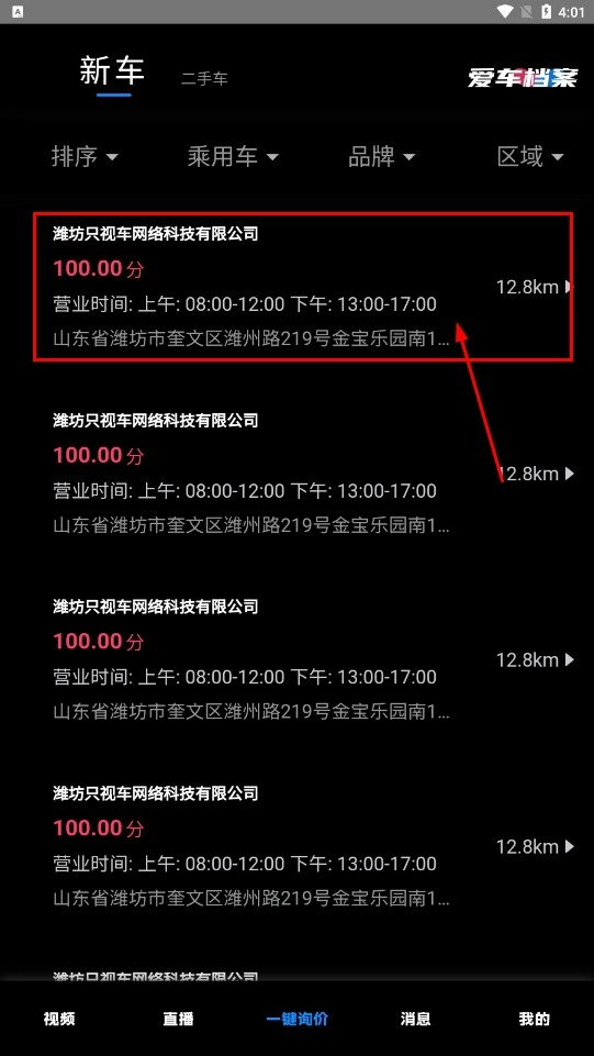 在新车板块,可查看潍坊只视车网络科技有限公司等车行的相关信息,涵盖评分、营业时间、地址以及距离等内容。