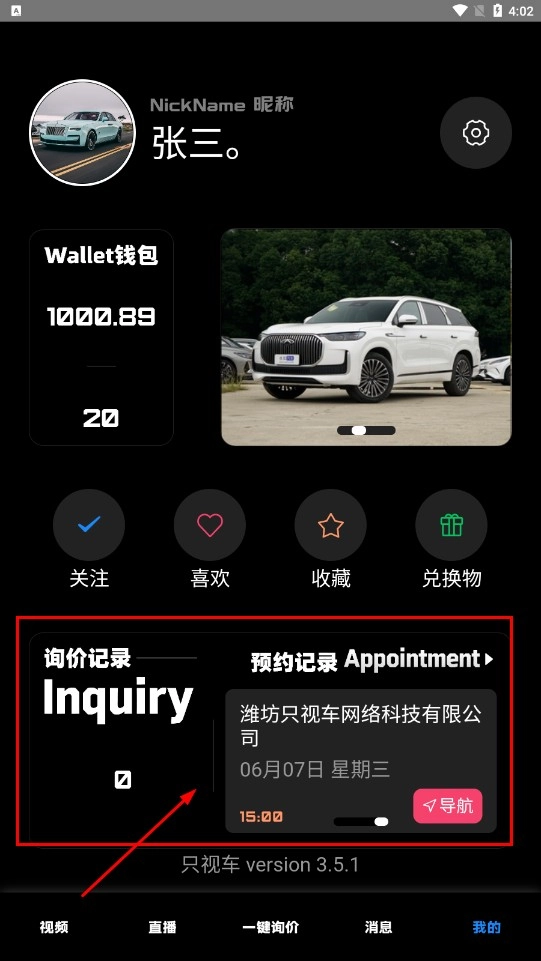 进入【我的】页面后,可以查看询价记录和预约记录(例如潍坊只视车网络科技有限公司的相关预约信息),同时也能找到钱包、关注、喜欢等功能区域。